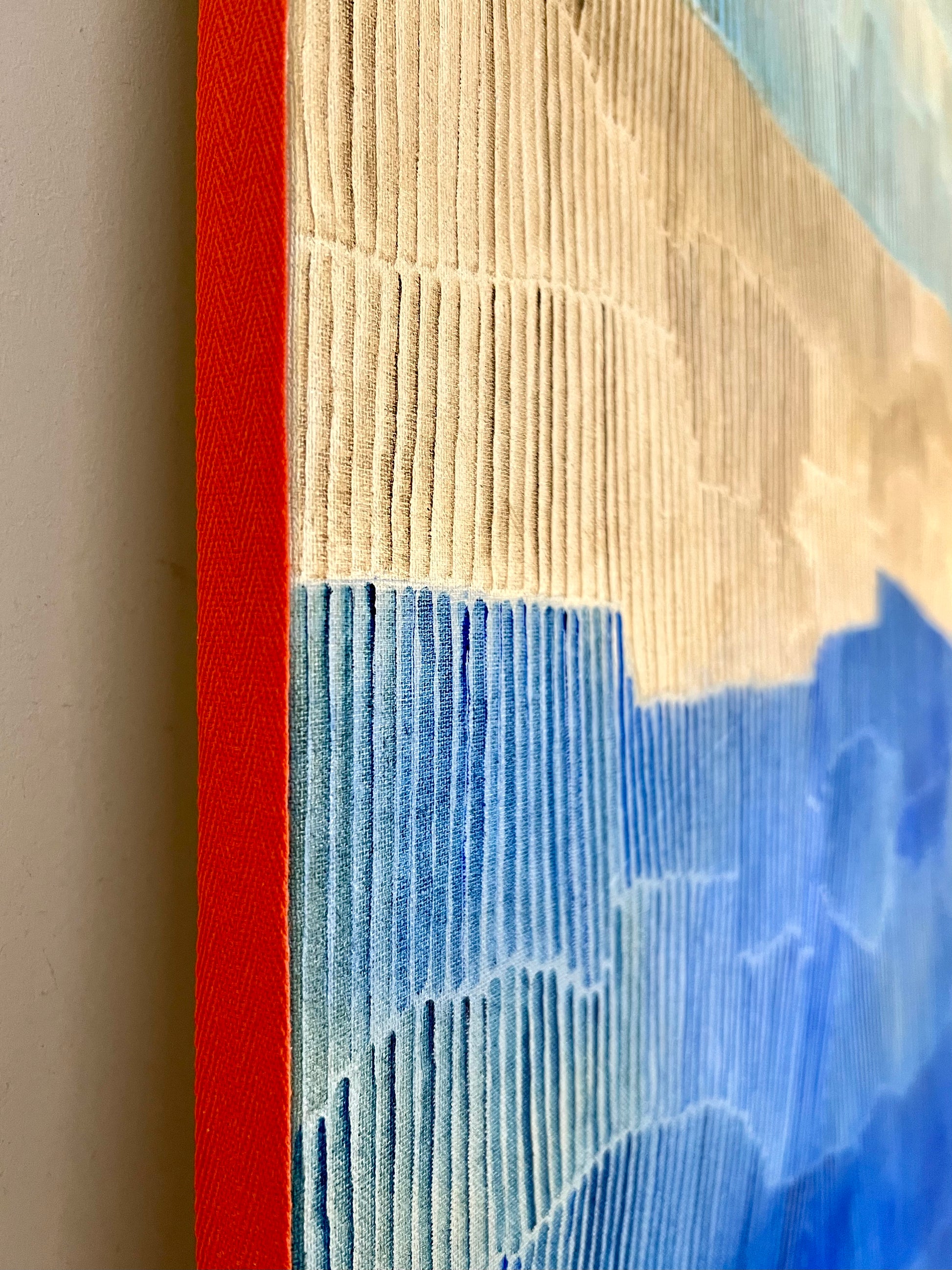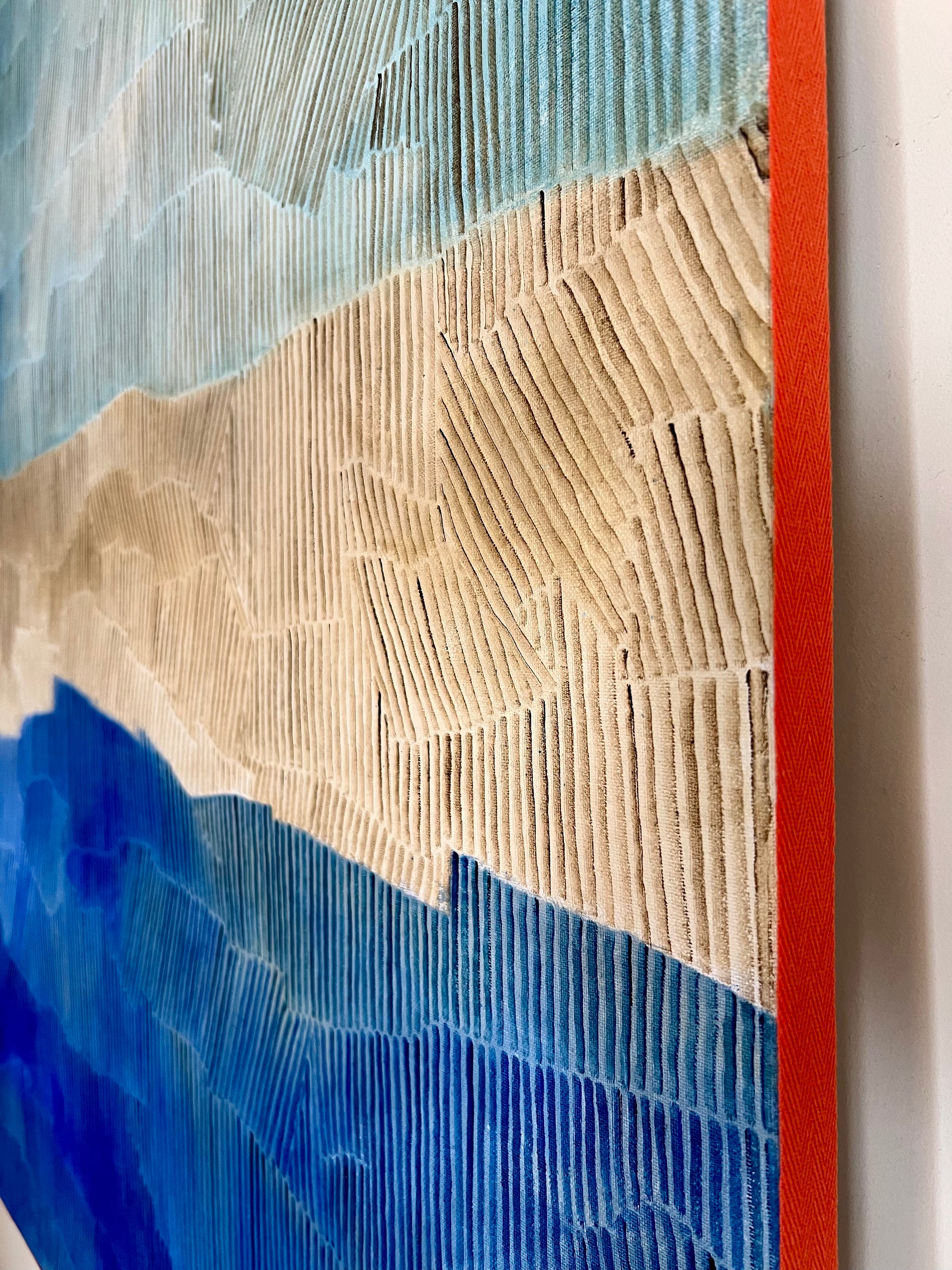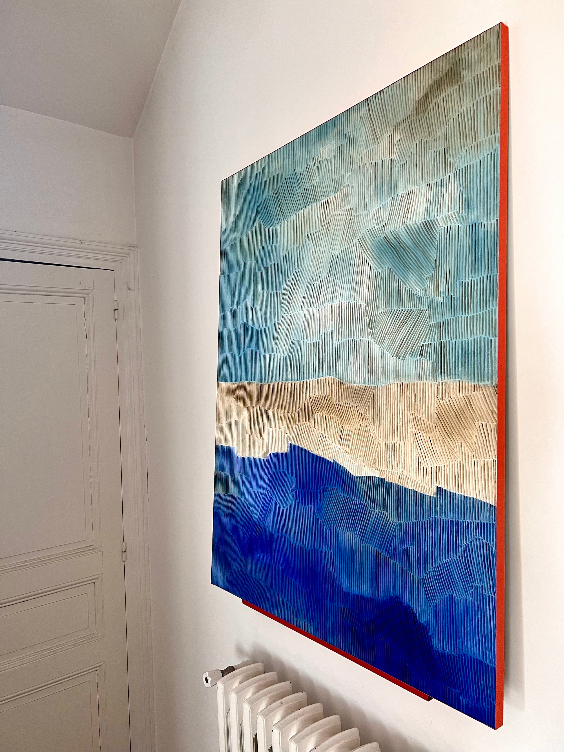 Dans cette toile de grand format, LABB explore les teintes sablées, lumineuses et chaleureuses, typiques de son langage pictural. L’œuvre se déploie comme un relief minéral et organique, façonné par le vent, le temps et le silence. Des strates de peinture, minutieusement tracées, suggèrent un banc de sable vu du ciel.