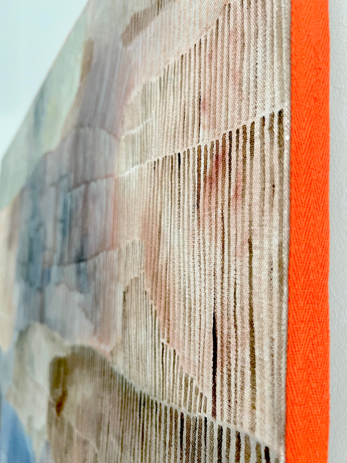 À travers ses lignes verticales minutieusement peintes, LABB explore ici la notion de temps géologique et de profondeur naturelle, jouant avec les tons beiges, bruns, gris et bleus dans une composition à la fois brute et apaisante.