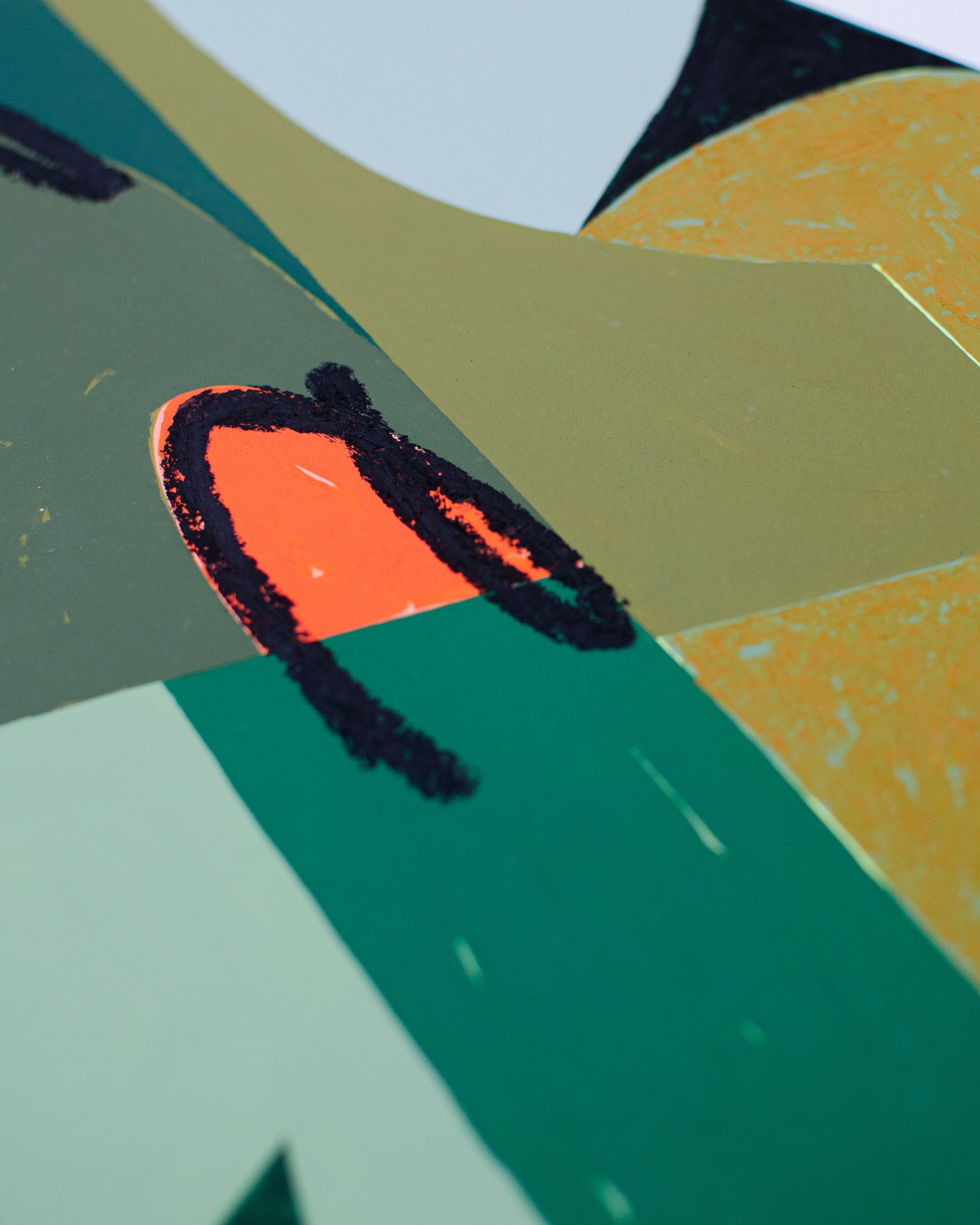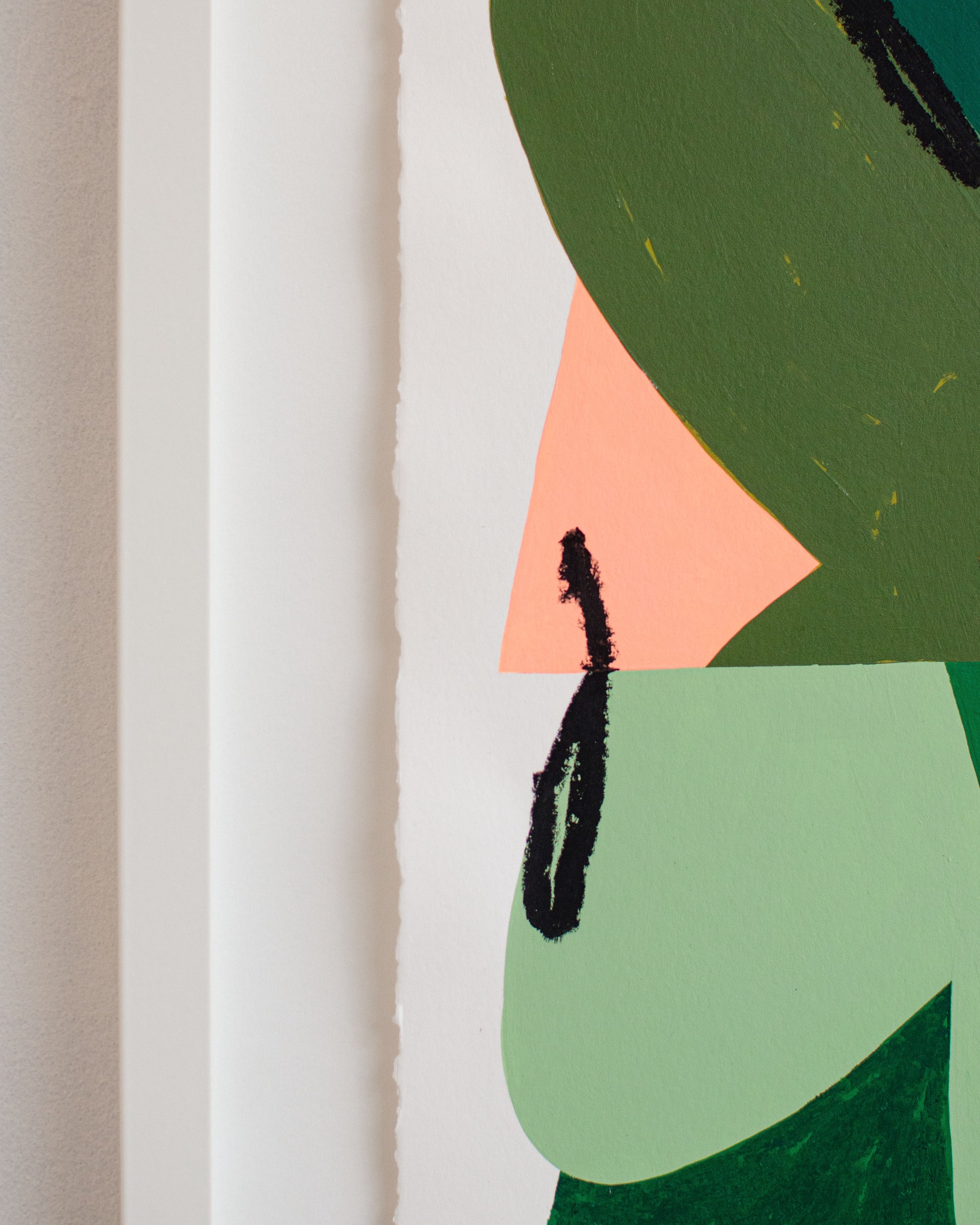 Dans cette œuvre, les verts profonds dialoguent avec des nuances pastel et une touche d’orange incandescent, formant un équilibre vibrant et spontané. Le papier texturé, les contours irréguliers, et les formes presque dansantes évoquent à la fois la nature, le mouvement, et l’émotion pure.
