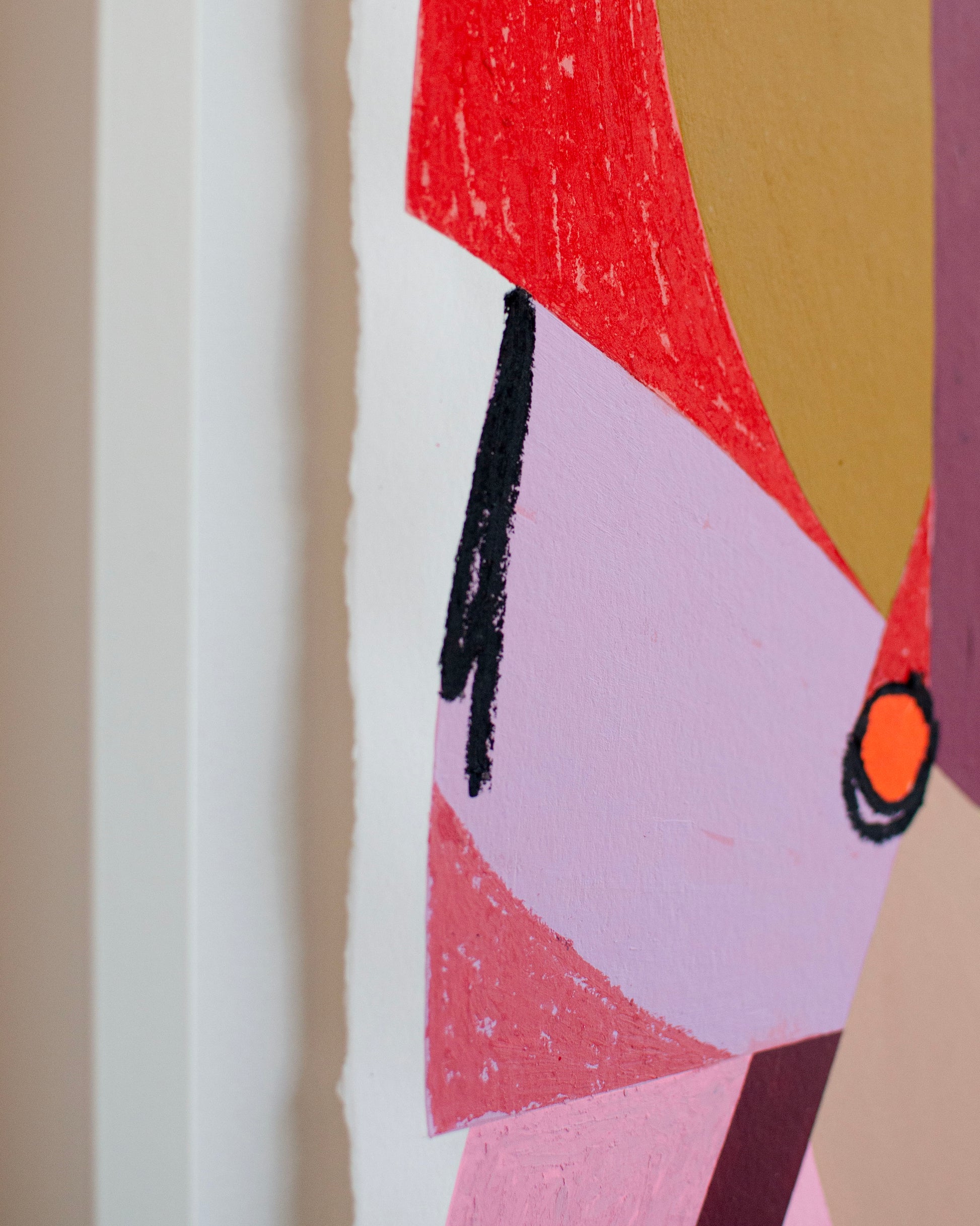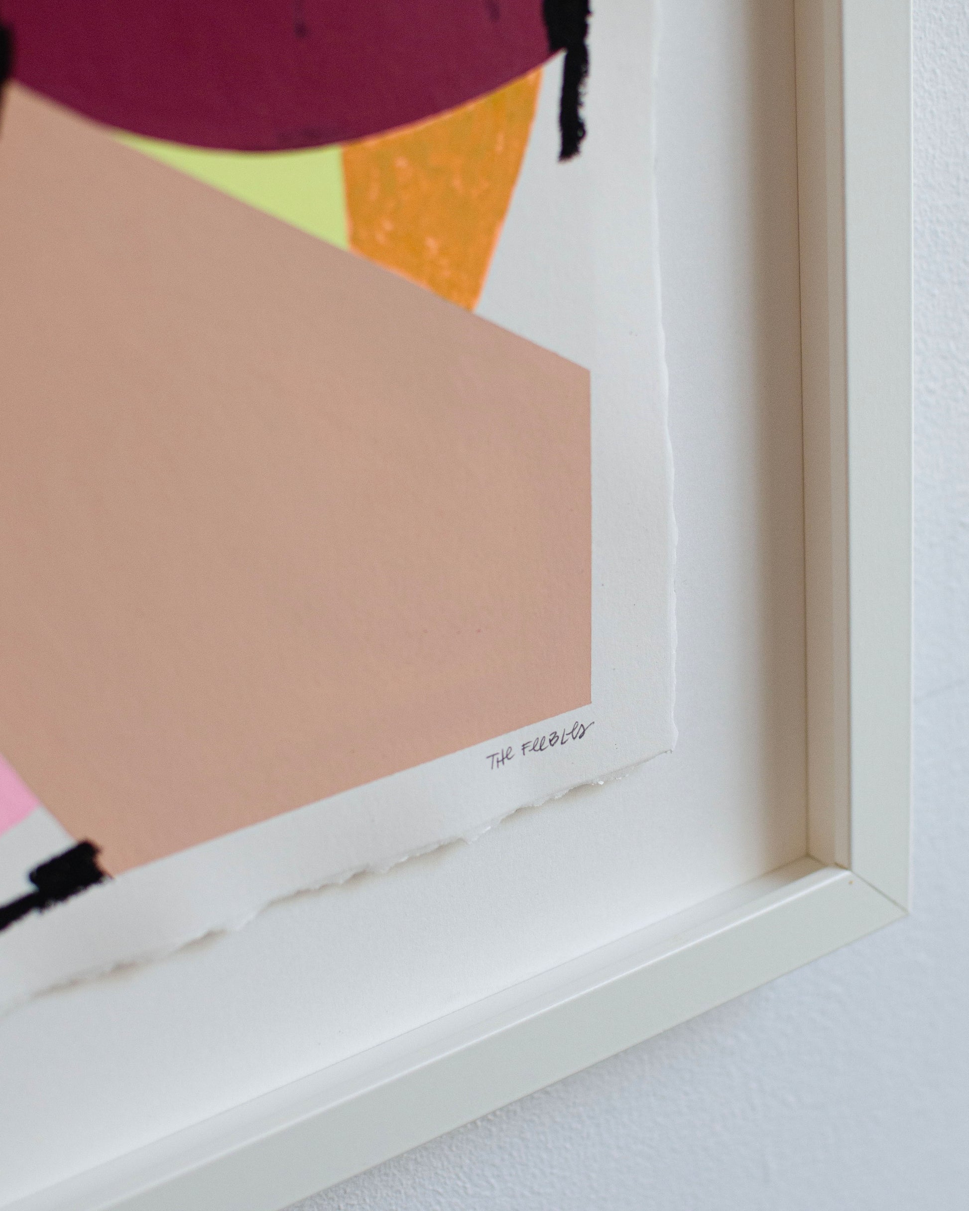 Ébauche #6 est une composition audacieuse et spontanée, dans laquelle The Feebles explore la rencontre des formes et des couleurs avec une liberté maîtrisée. Sur un fond blanc texturé de papier à bords frangés, des fragments colorés se chevauchent : rouges profonds, roses poudrés, ocres brûlés et touches orangées se combinent en une harmonie visuelle vive et énergique.