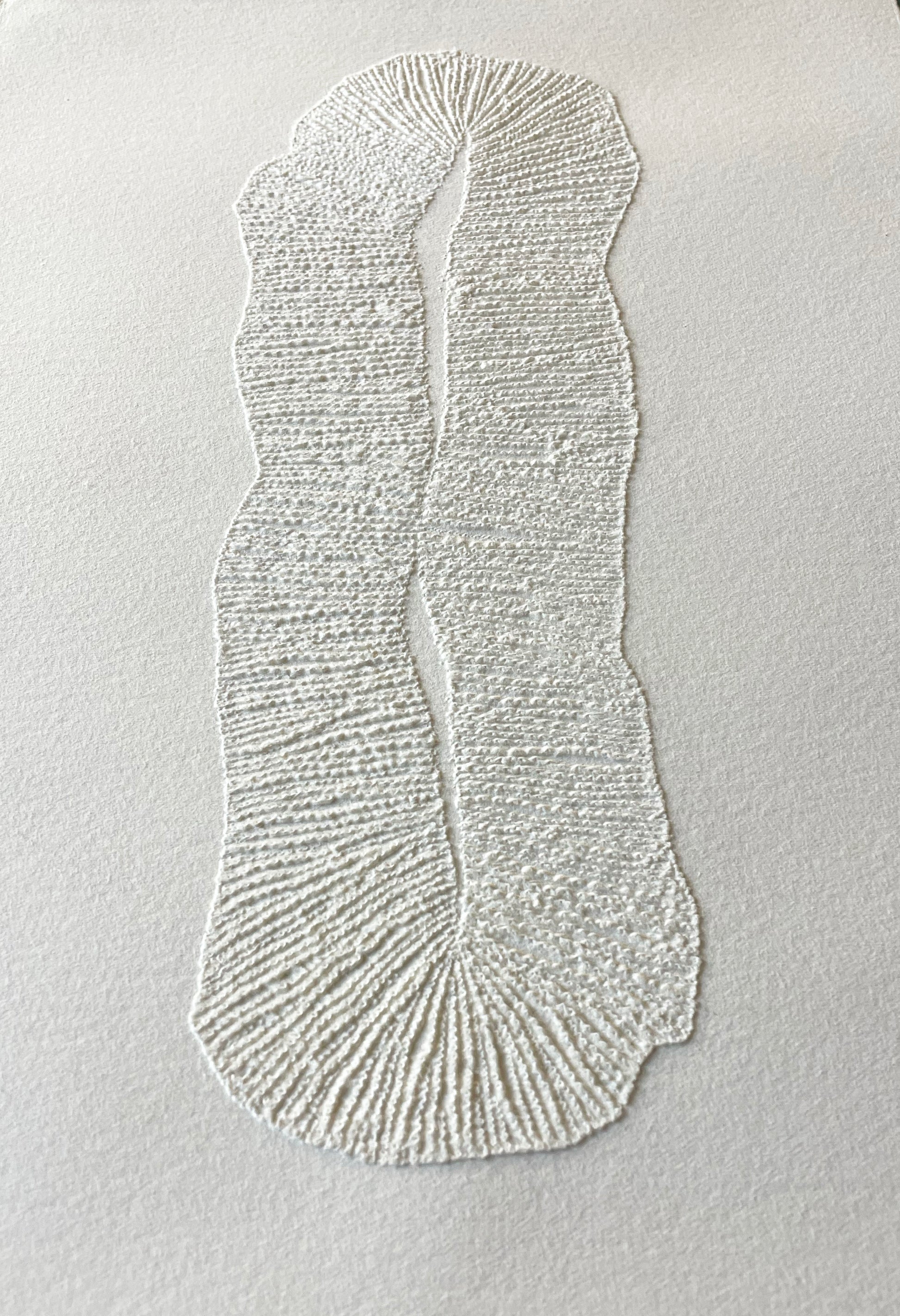 La forme centrale, douce et symétrique, évoque une coquille fossile, un corail ou une algue marine, et se détache avec élégance sur le fond blanc du papier d’Arches. La répétition du geste, presque méditative, inscrit l’œuvre dans une temporalité lente, où chaque point raconte la patience, la concentration et la respiration.