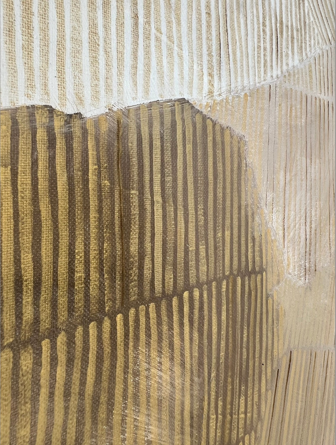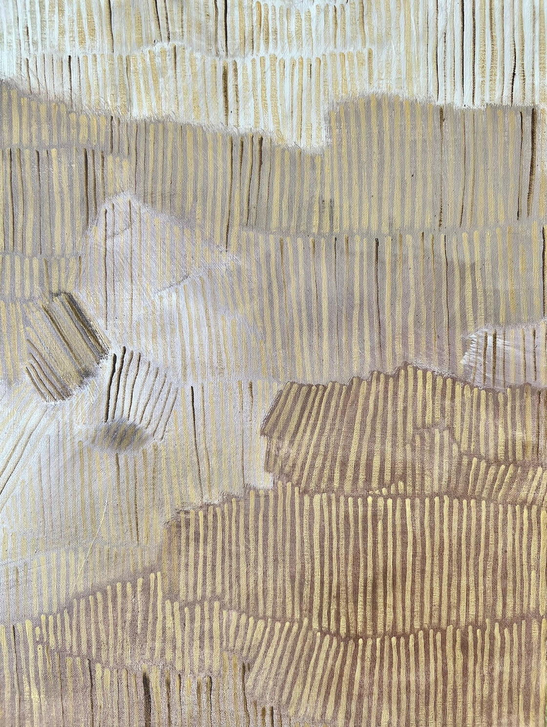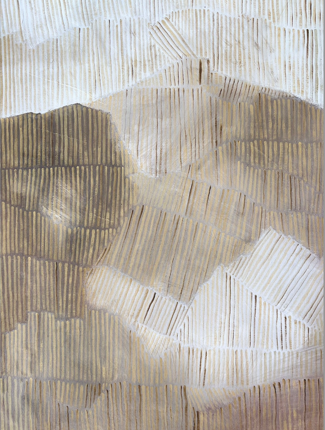 À travers une palette de tons sable, ocre, crème et or, cette toile abstraite évoque un paysage en élévation – des collines doucement caressées par une lumière dorée, entre ciel vaporeux et terre structurée. Chaque ligne verticale, tracée avec minutie, sculpte l’espace et invite à une contemplation silencieuse.