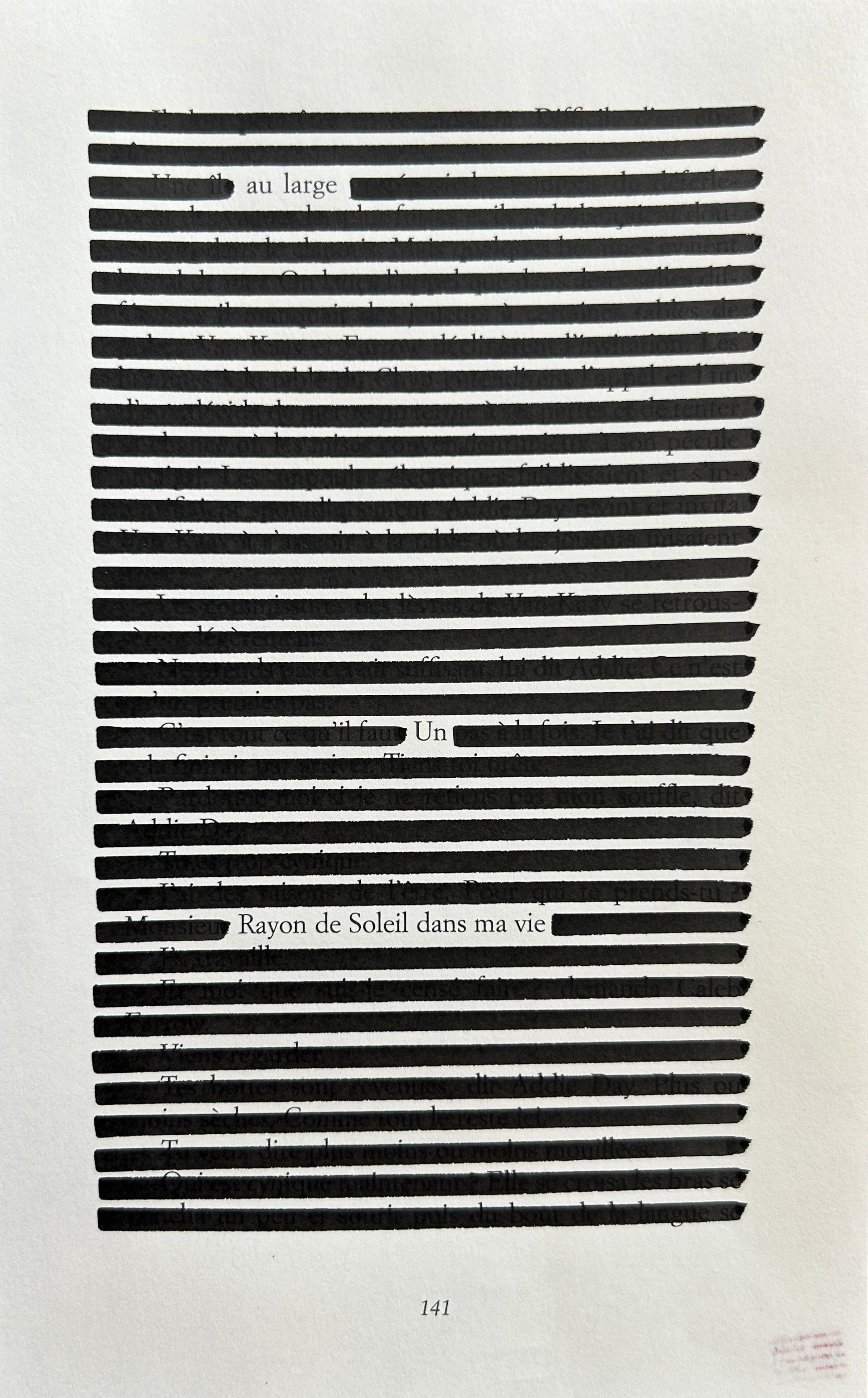 Au travers des lignes parallèles tracées au feutre par l’Artiste, découvrez un Haïku ou un court poème n’ayant rien à voir avec le texte original.