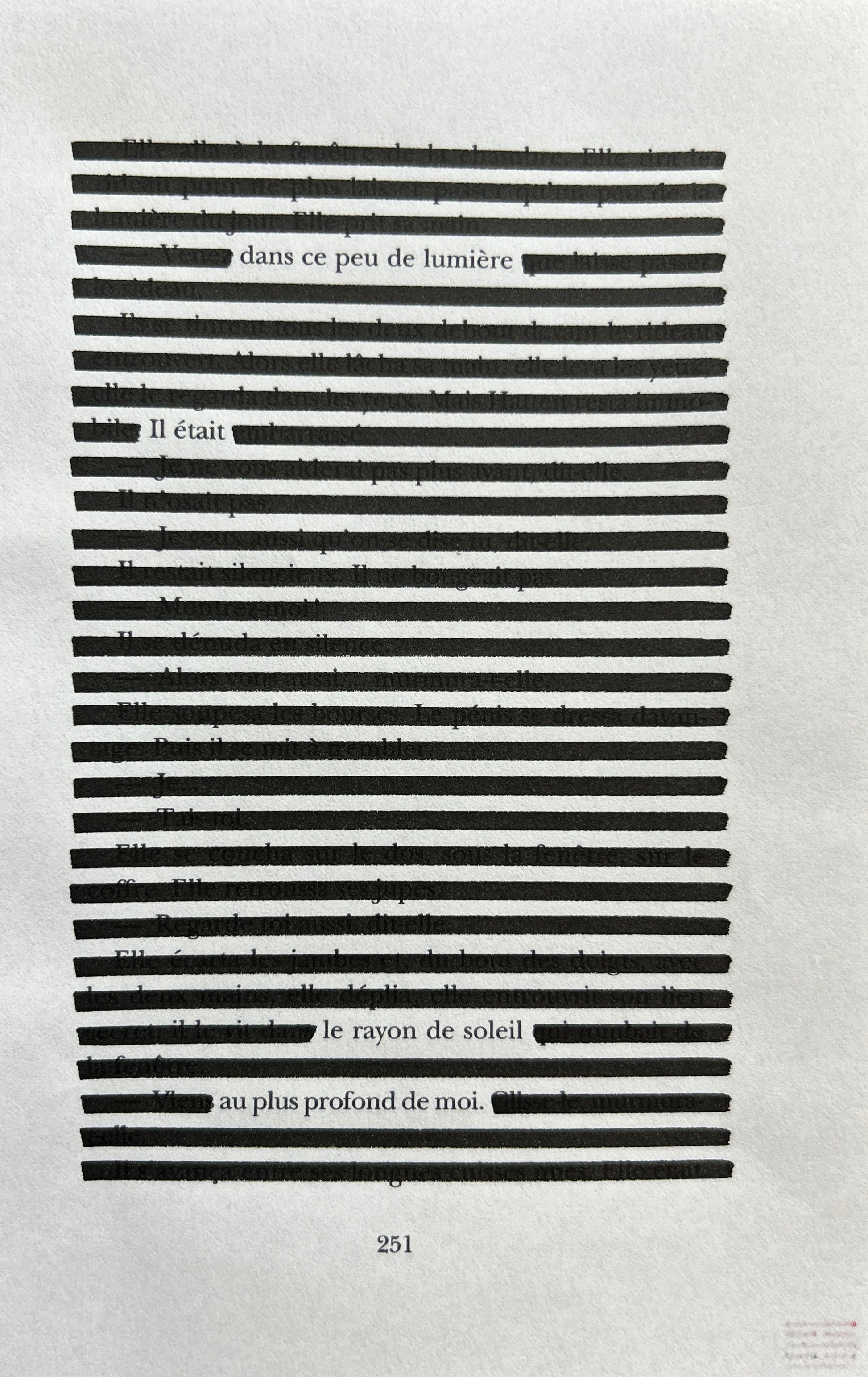 Ce poème n’a pas été écrit, il a été trouvé — caviardé ligne à ligne, avec la précision d’un orfèvre. Le noir devient révélateur. Les mots restants deviennent essentiels.