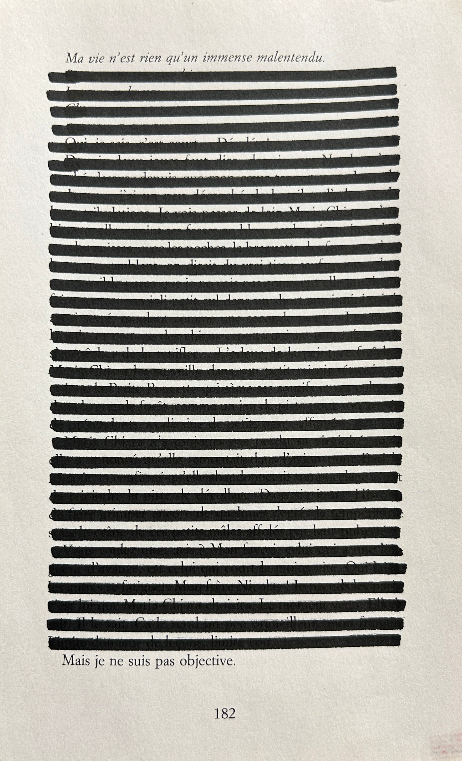 Au travers des lignes parallèles tracées au feutre par l’Artiste, découvrez un Haïku ou un court poème n’ayant rien à voir avec le texte original.