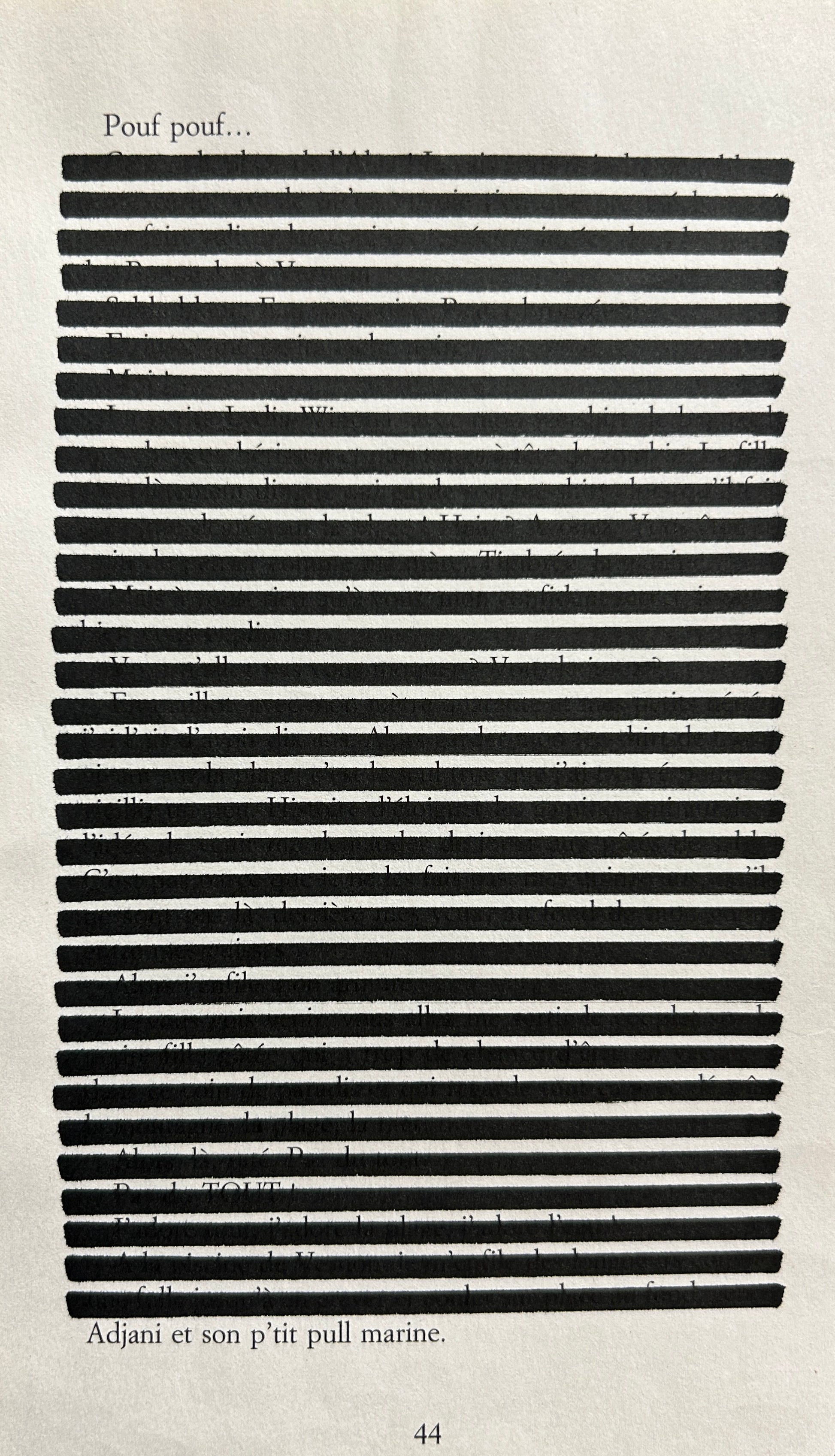 Au travers des lignes parallèles tracées au feutre par l’Artiste, découvrez un Haïku ou un court poème n’ayant rien à voir avec le texte original.