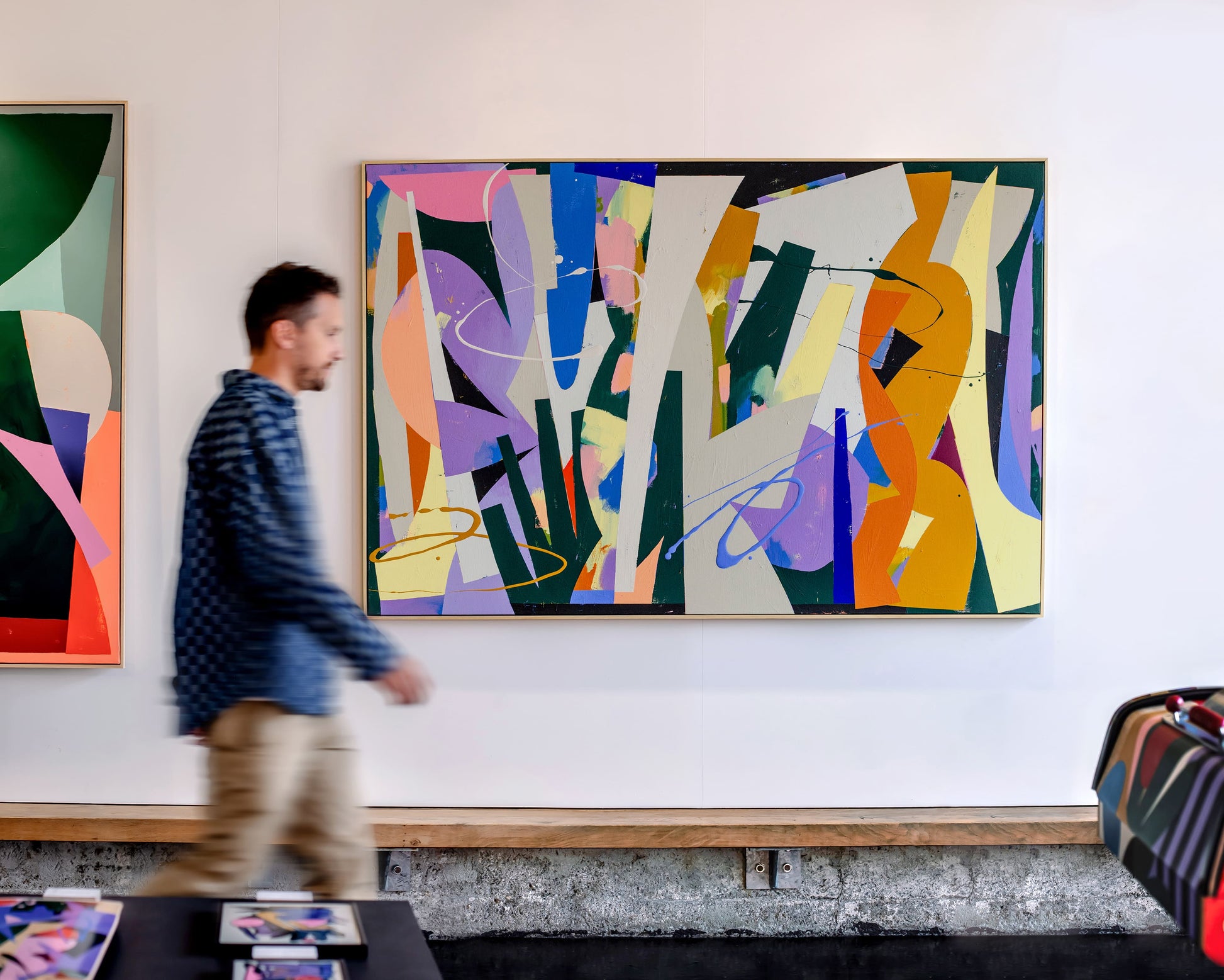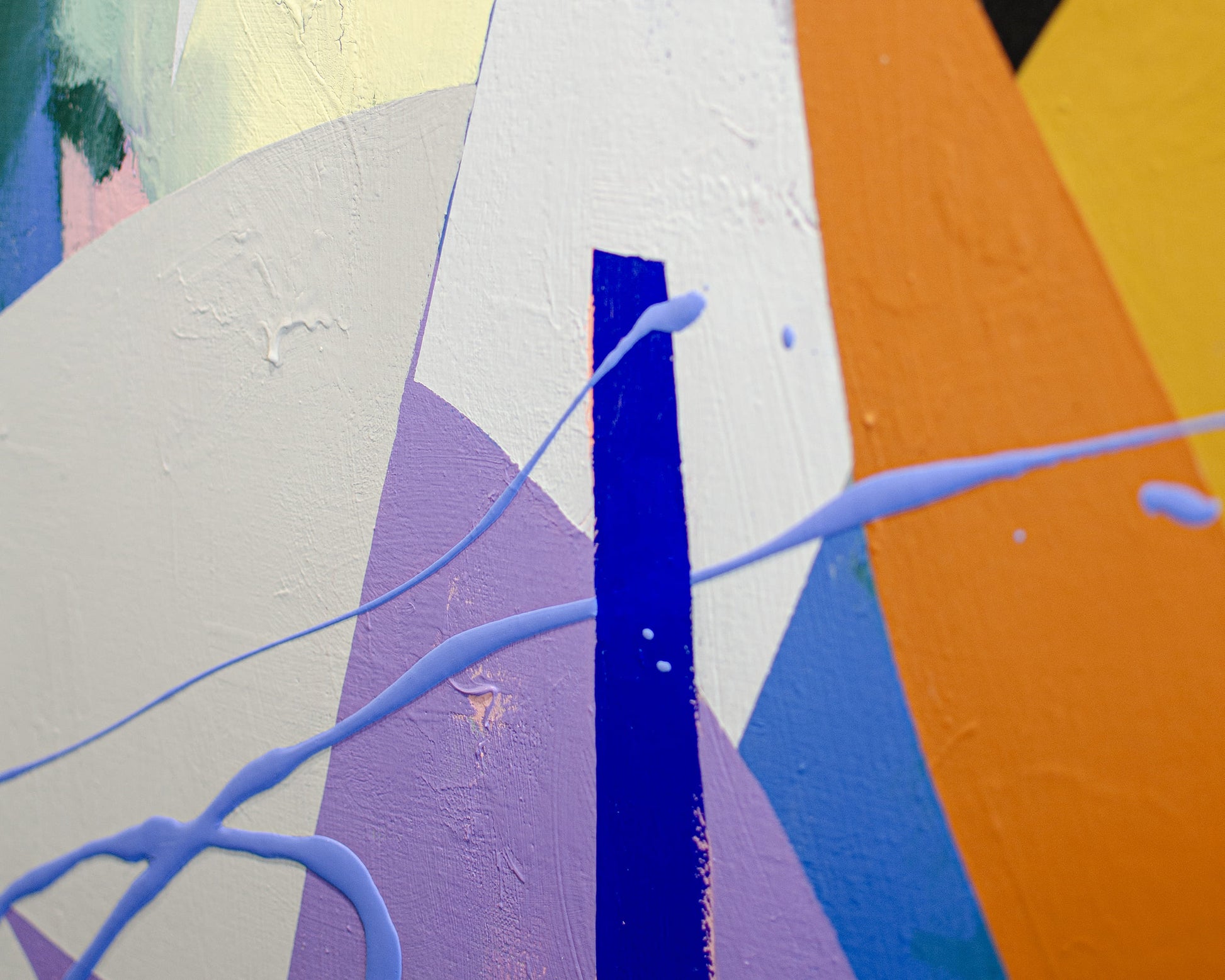Postérité est une peinture grand format signée The Feebles, réalisée à l’acrylique sur bois. Cette composition abstraite dynamique associe des formes géométriques déconstruites et des gestes libres, créant un univers visuel à la fois rythmique et expressif.