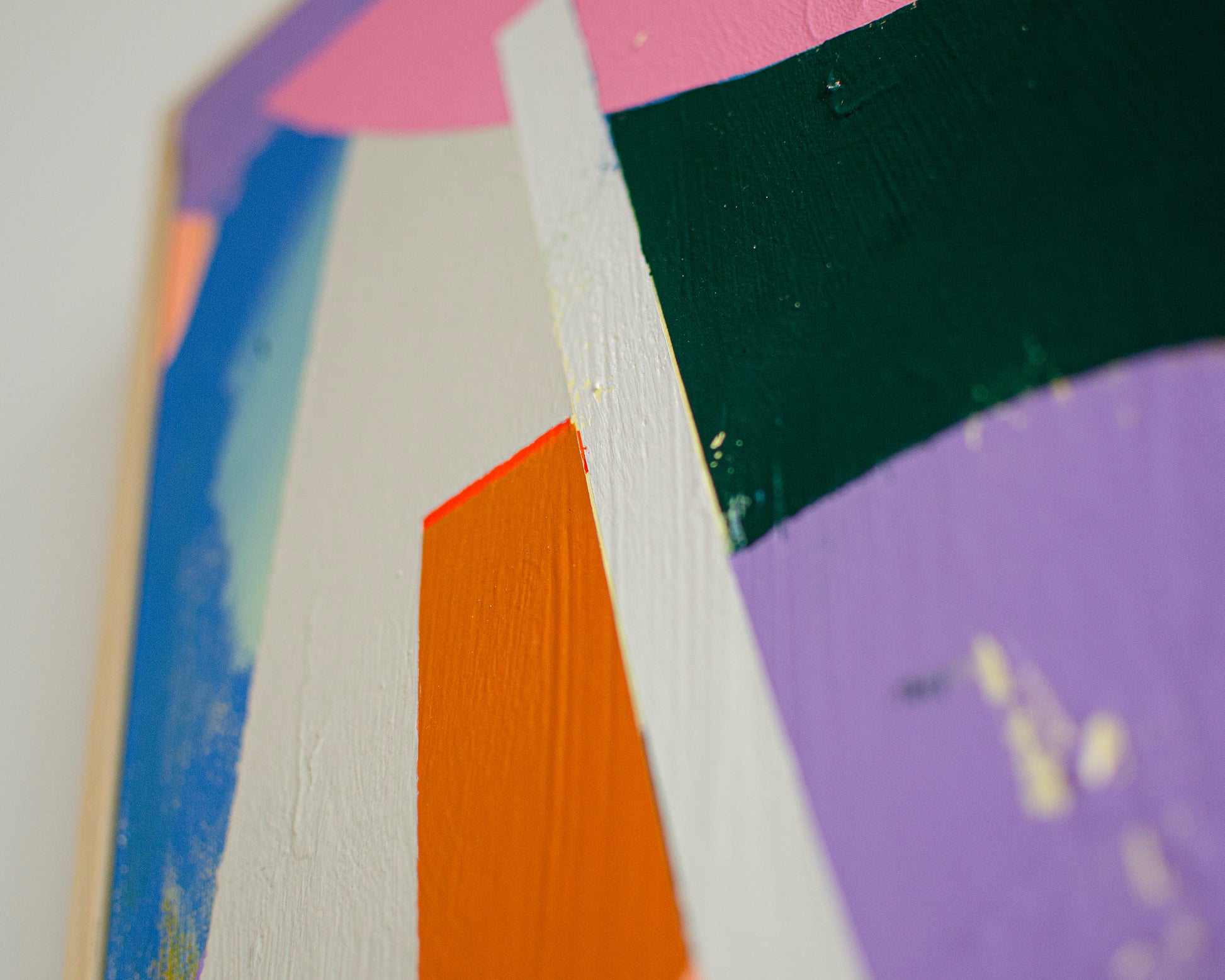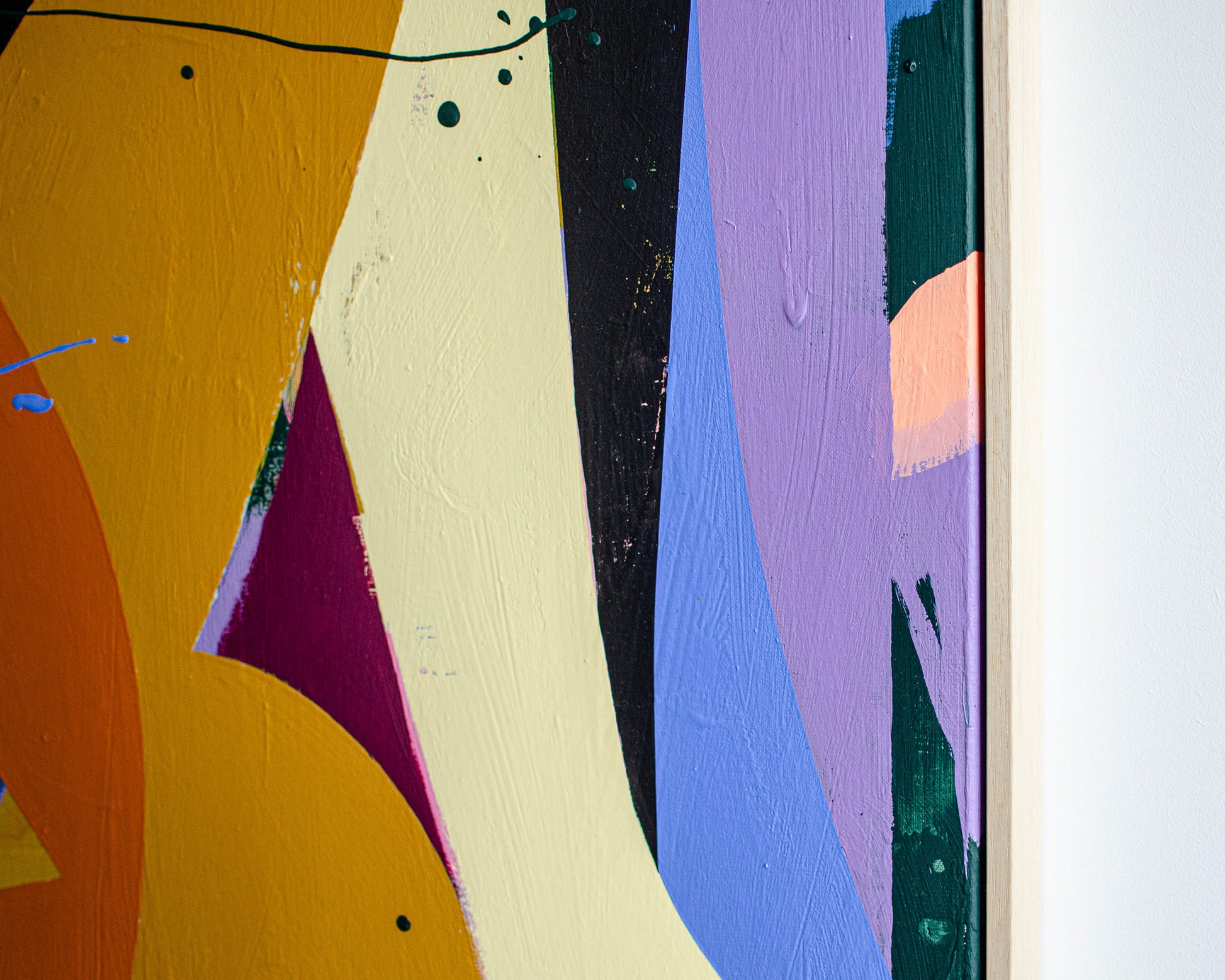 La palette audacieuse combine des tons chauds et froids – orange, jaune, violet, bleu et vert sapin – avec des touches pastel, pour un équilibre subtil entre énergie et élégance. Cette pièce unique s’impose comme une œuvre forte pour habiller un intérieur contemporain ou une collection d’art design.