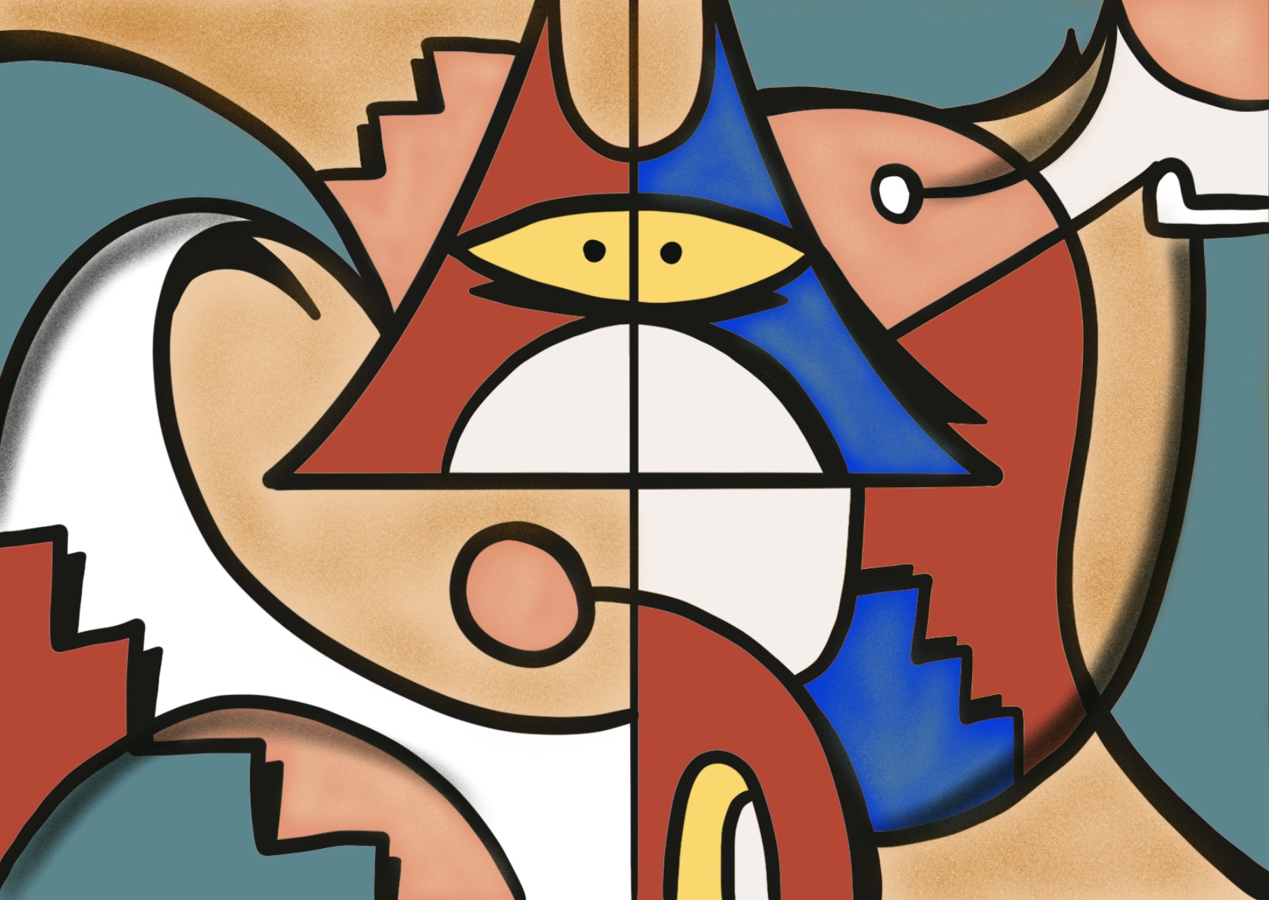 Dans cette composition miroir, deux figures énigmatiques semblent se faire face, entre allusion tribale et abstraction contemporaine. Les formes triangulaires, les marches et les courbes évoquent le mouvement, l’élévation et l’introspection. Les couleurs — rouge terre, bleu électrique, jaune solaire, blanc os — vibrent dans une harmonie tendue, renforcée par le flouté subtil du geste à l’aérosol.