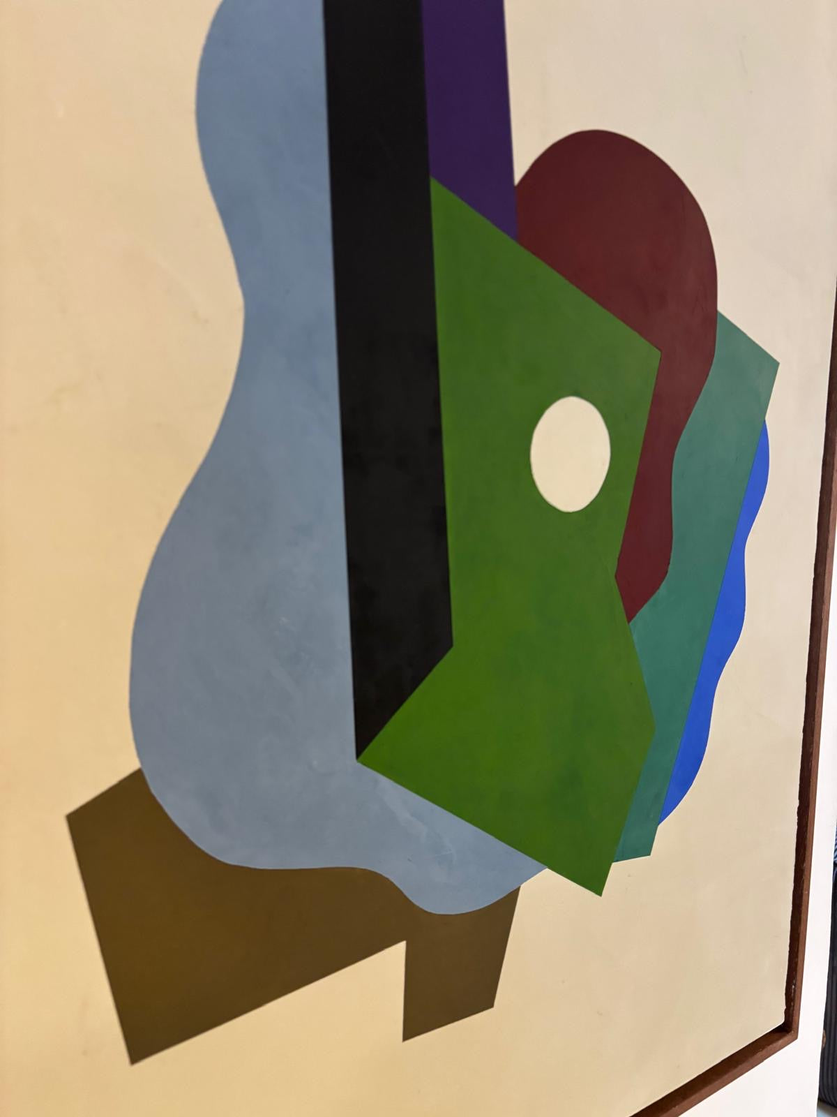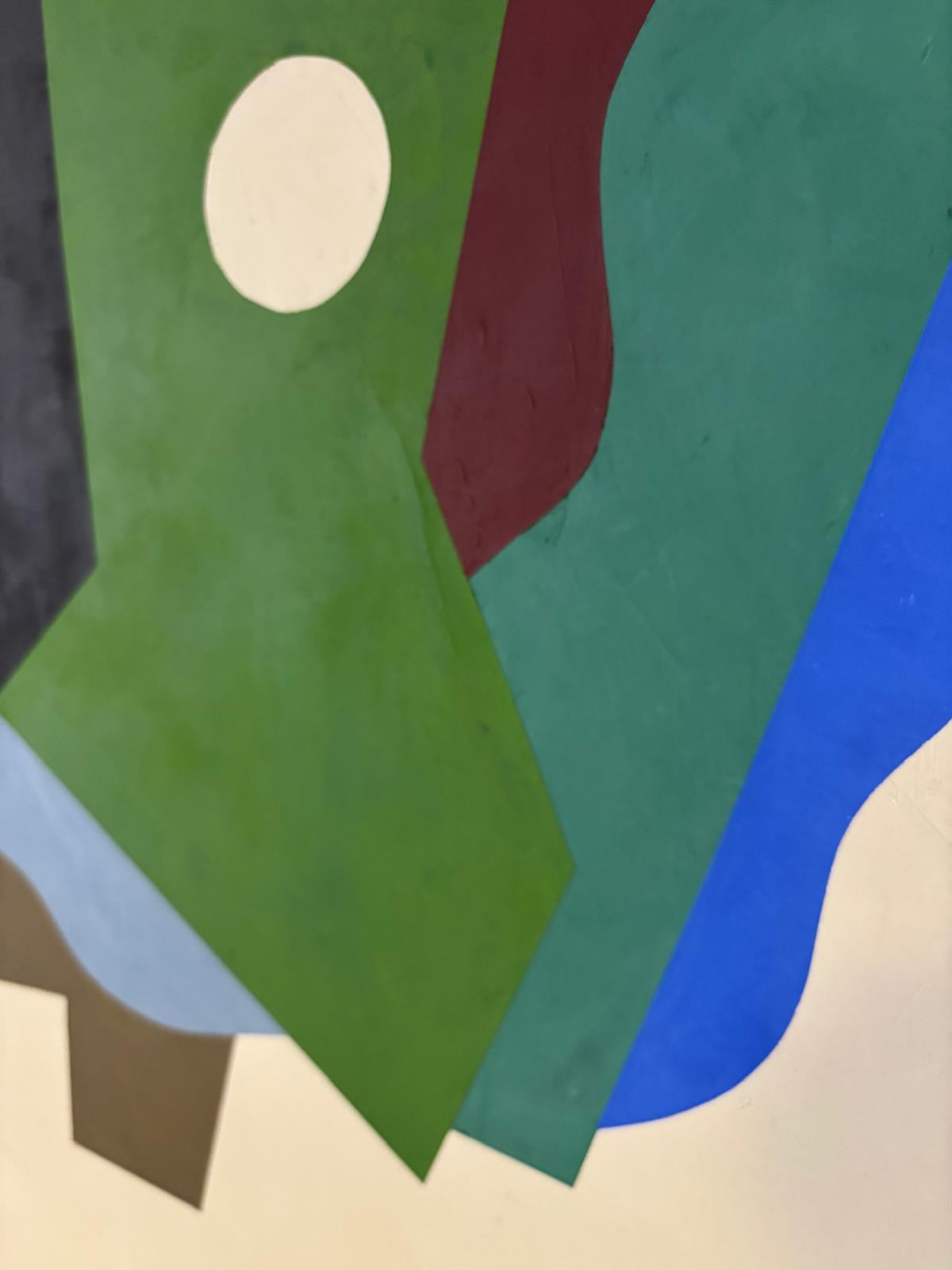 Dans cette œuvre Audrey Noël poursuit sa recherche autour de la forme pure, de la couleur dense et de l’équilibre silencieux. Ici, des aplats géométriques aux contours nets s’entrelacent dans une chorégraphie parfaitement maîtrisée. Le fond écru permet aux formes — vert profond, bleu ardoise, noir, bordeaux et kaki — de vibrer avec intensité.