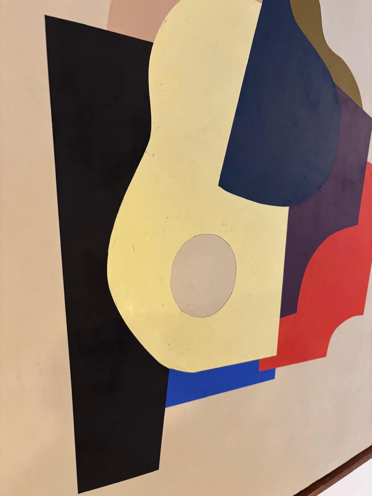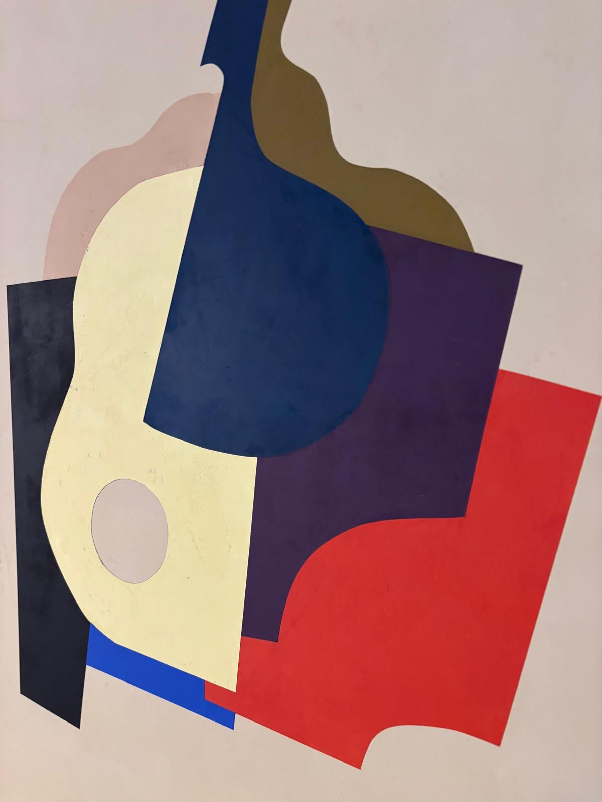 Dans cette oeuvre Audrey Noël poursuit son exploration de l’abstraction à travers un langage formel épuré et une palette chromatique subtile. Les formes, superposées avec précision, semblent s’emboîter comme les pièces d’un puzzle mental. Le fond écru valorise les aplats profonds de bleu nuit, de jaune pâle, d’ocre, de noir et de rouge vermillon.