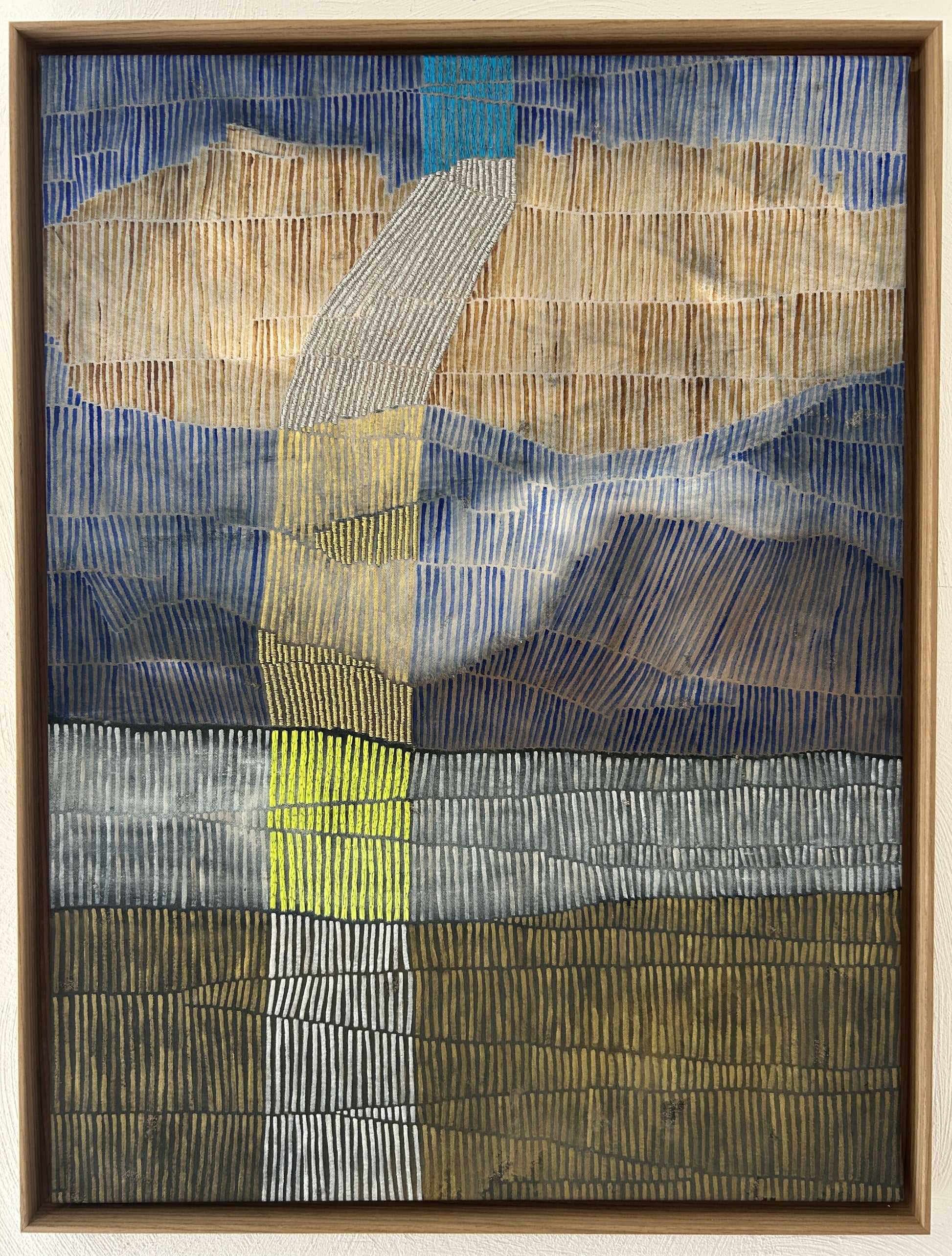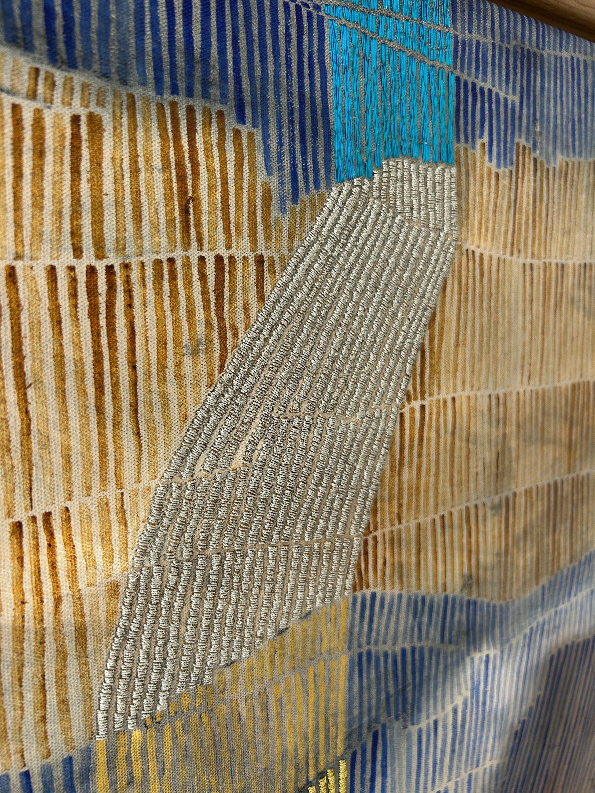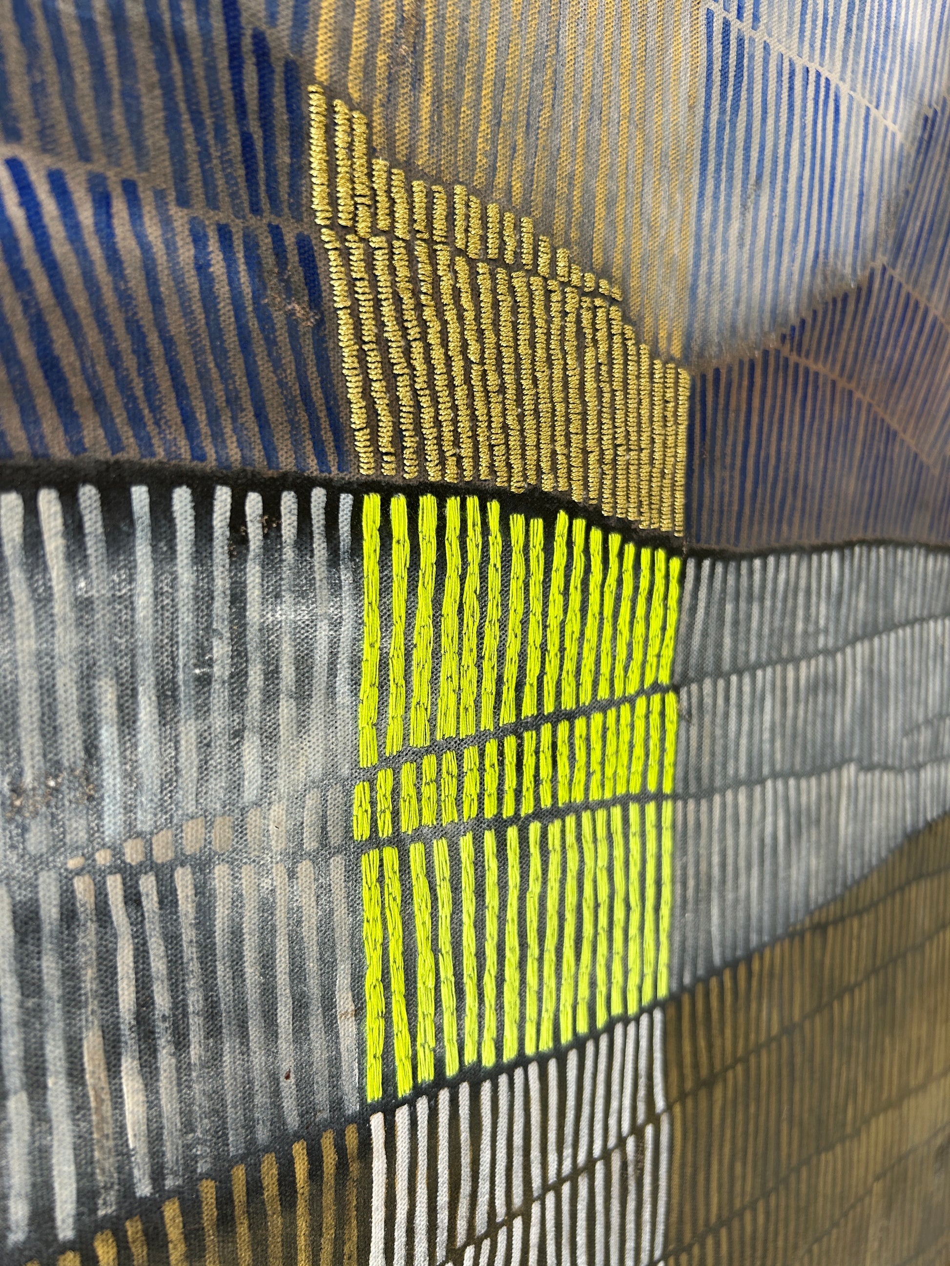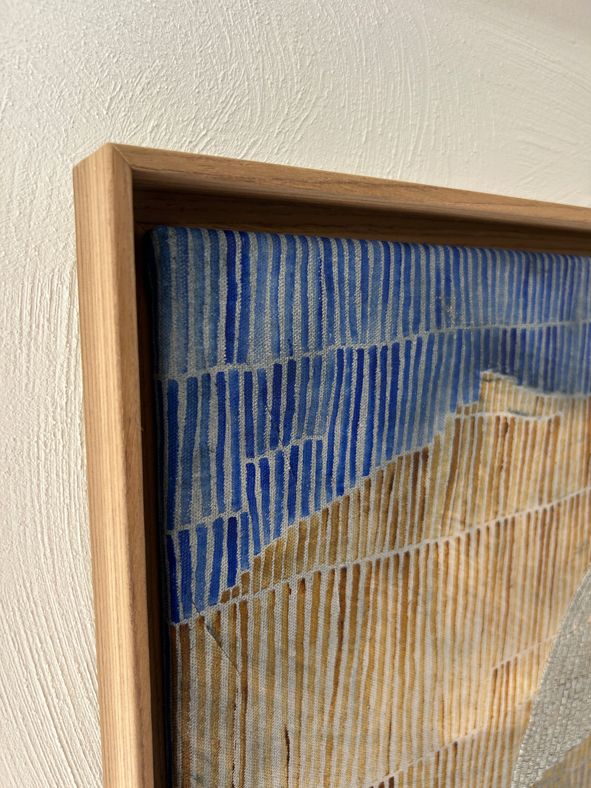 Découvrez cette toile abstraite contemporaine signée par l’artiste LABB, une création unique qui incarne le dialogue entre nature, rythme et lumière. Cette œuvre dévoile un travail minutieux sur les lignes graphiques verticales, associées à des nuances harmonieuses de bleu, d’ocre et de blanc, ponctuées de touches lumineuses de jaune. Une fois peinte cette toile a été brodée en partie.