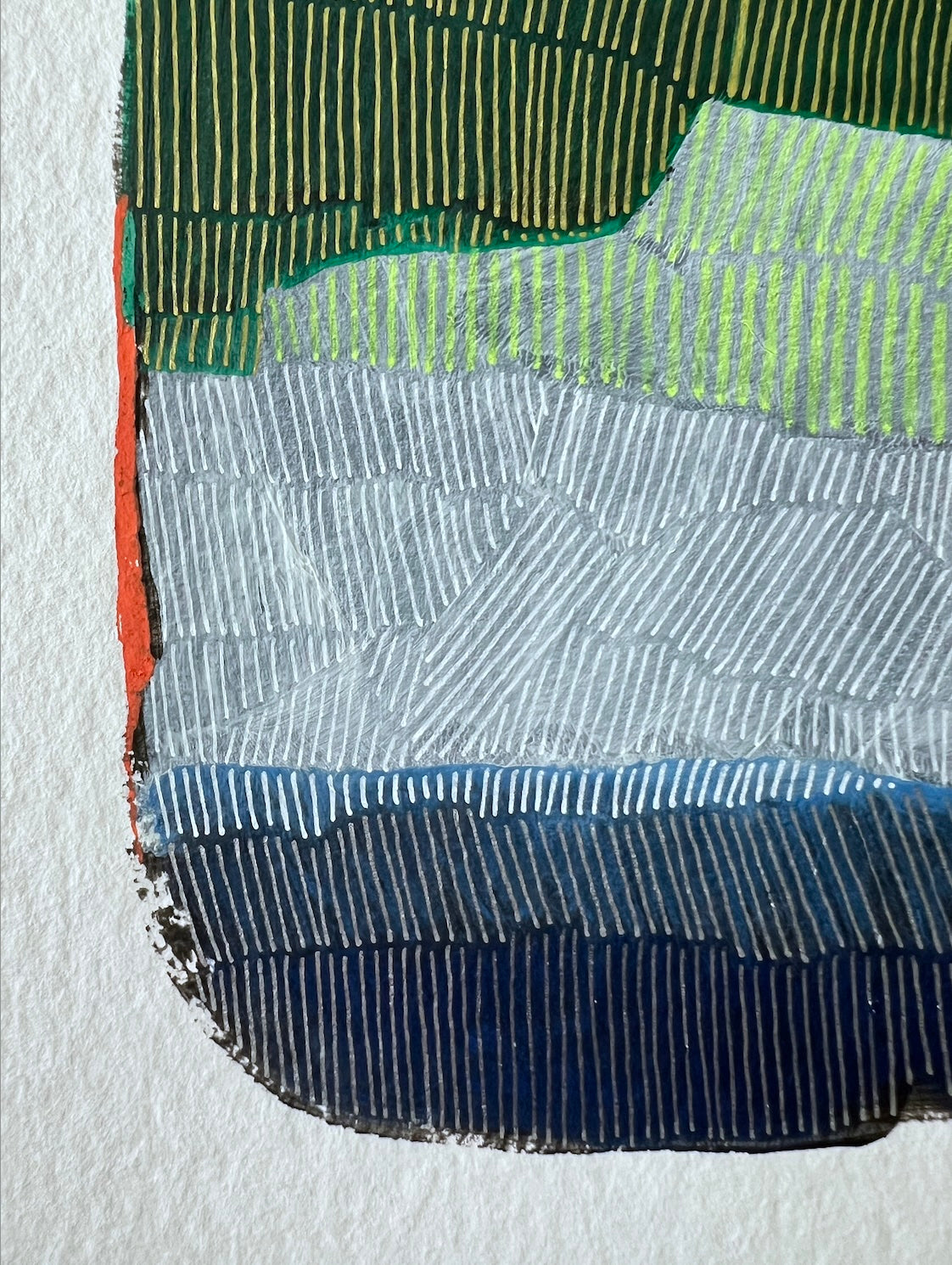 Sur papier à dessin 425gr, l’artiste applique plusieurs couches d’huile, comme elle le fait sur ses toiles, apportant une profondeur veloutée aux zones de couleur. Par-dessus ces aplats, elle vient inscrire à la main une infinité de traits au Posca et au crayon, dans une lente chorégraphie quasi méditative.