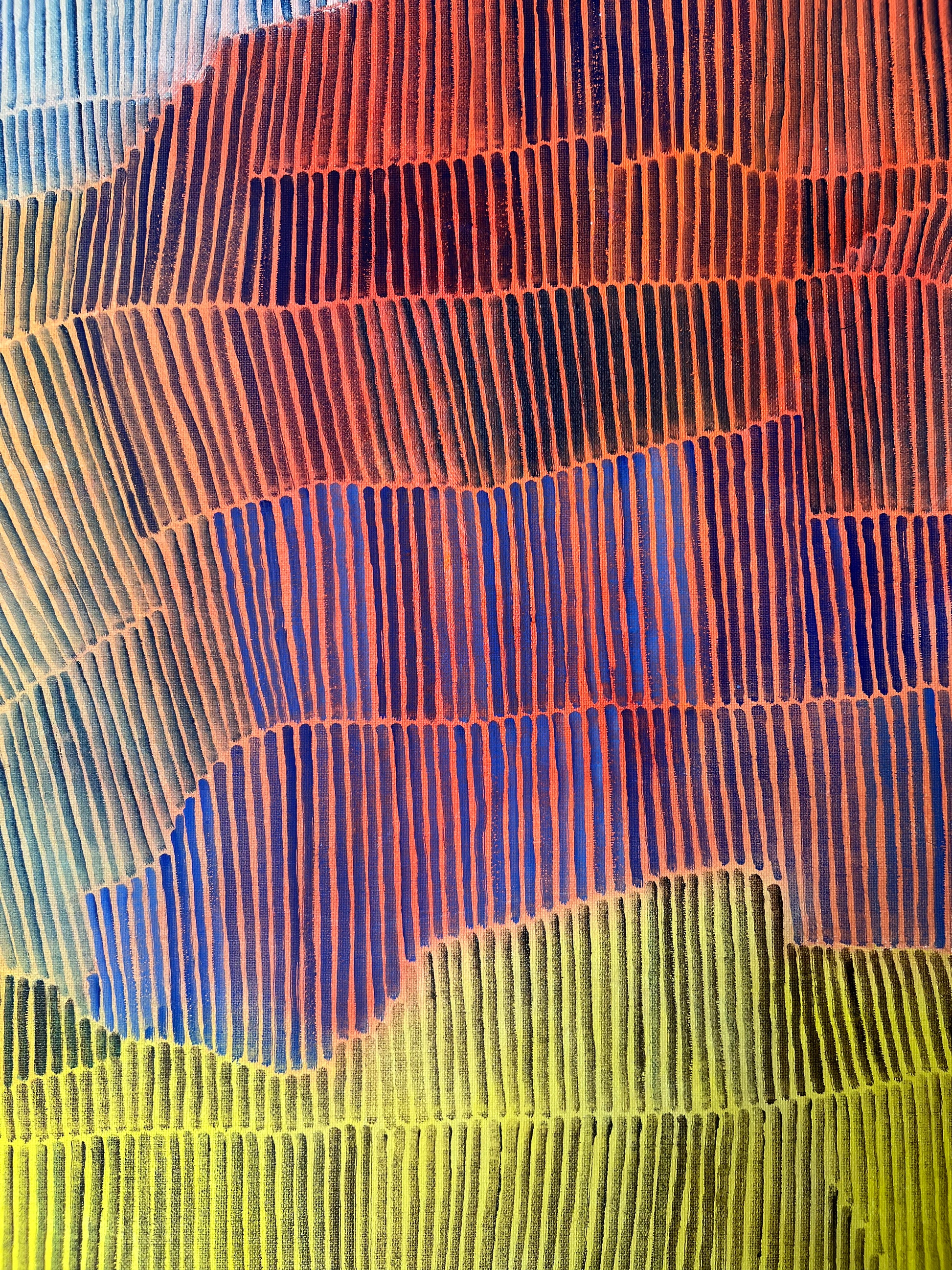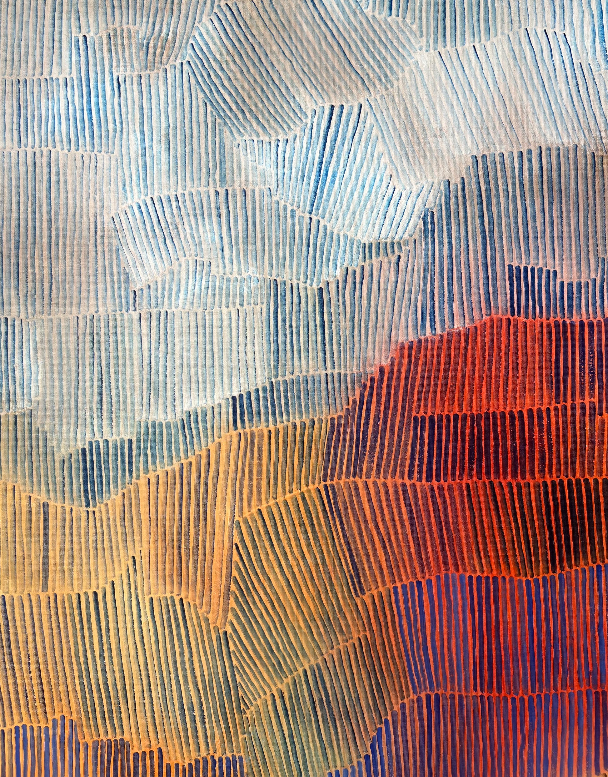 Sunset est une immersion dans un paysage abstrait où les lignes vibrantes de LABB traduisent le mouvement de la lumière en fin de journée. Le haut du tableau évoque des nuages teintés de bleu et de gris, tandis que le centre explose en nuances orangées et rouges brûlants. Plus bas, des jaunes éclatants et des bleus profonds suggèrent les reflets du soleil couchant sur des collines ou des champs baignés de lumière.
