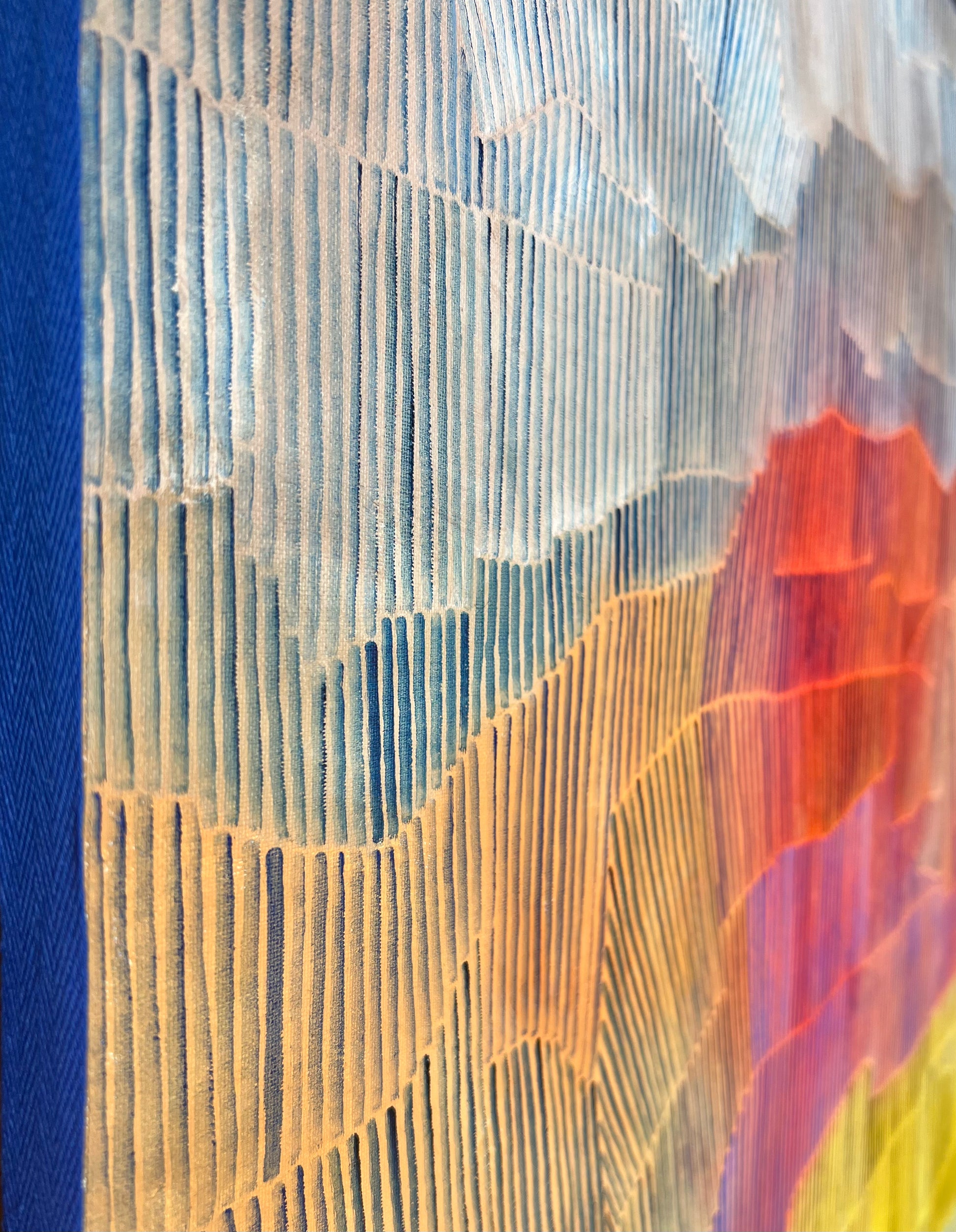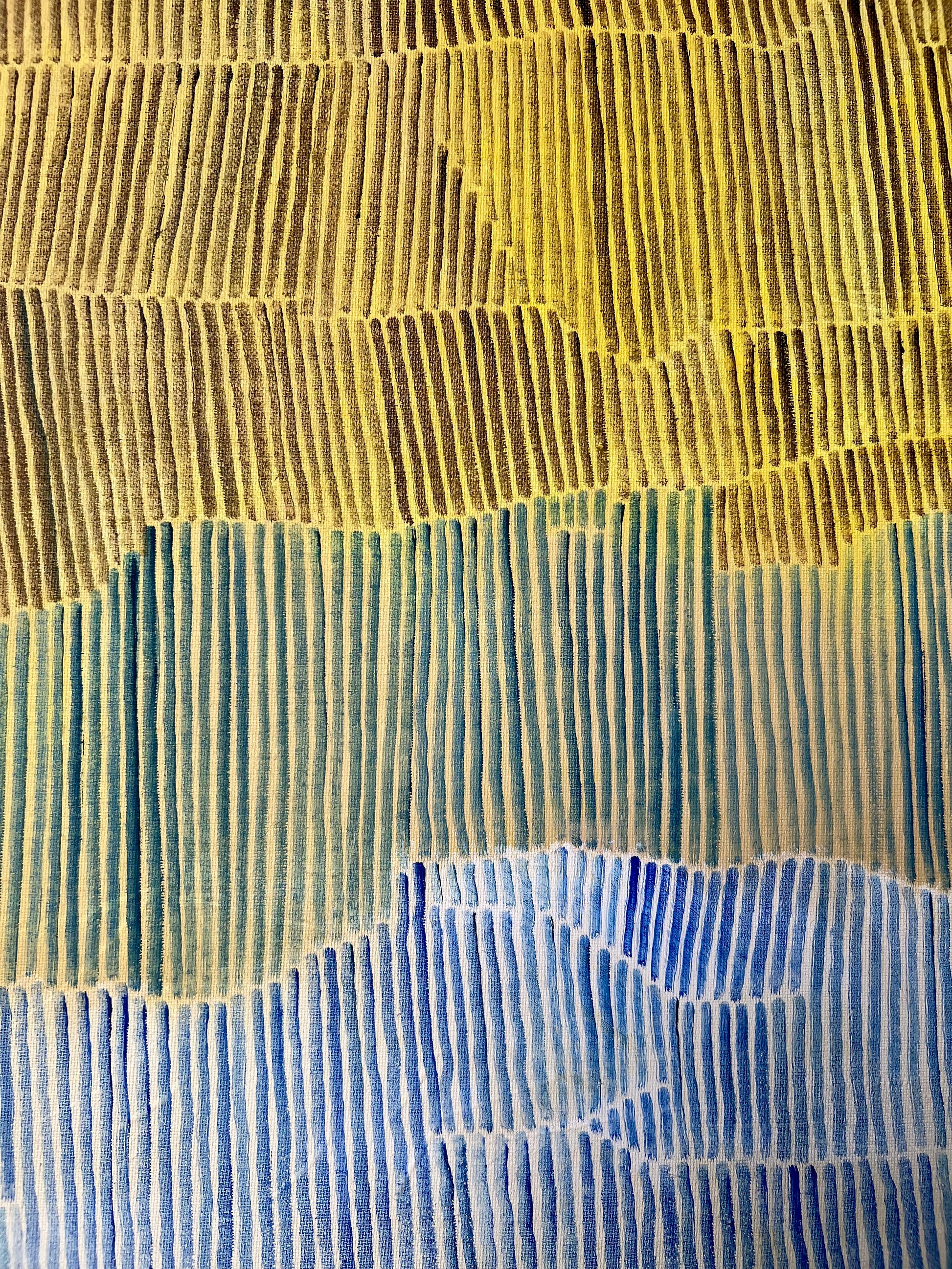 Par sa composition en strates rythmiques, cette œuvre nous invite à un voyage visuel et sensoriel. On y lit une nature réinventée, entre abstraction et évocation poétique du réel. C’est une peinture vibrante, qui capte le regard et réchauffe l’espace qu’elle habite.